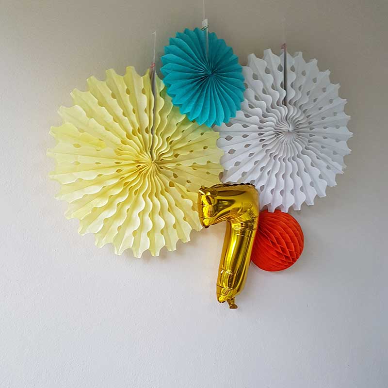 Pour compléter le tableau et faire de votre fête un moment aussi féérique que magique, découvrez les ballons chiffres et les rosaces aux teintes vives pour ensoleiller la salle. Orange, jaune, turquoise ou blanc, ces rosaces apporteront une note d’élégance à toute la décoration. Si vous avez choisi une grande salle, il faut compléter les rosaces par les boules alvéolées aux coloris variés. Avant de servir le gâteau d’anniversaire, décorez-le des bougies chiffres. Les bonbonnières pleines de dragées ou de sucreries sont à placer à côté du gâteau. Vous pouvez les orner de petits rubans en jute au ton naturel.