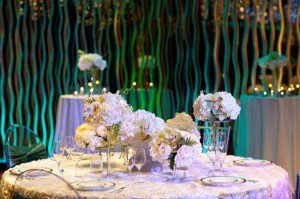 Pour mettre en évidence les verreries présentes sur les tables et pour apporter un effet tamiser et chaleureux à votre réception de mariage mettez dans l’ensemble de votre salle des projecteurs de lumière d’ambiance assorties aux couleurs de votre mariage.