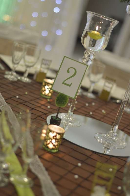 Le marron pour le surnappage, pour les noeuds sur housse de chaise blanche et le vert pour la bande de satin sur les surnappes, les fleurs, les menu et bande de ruban satin autour de chaque serviette, les photophores et bougies flottantes.Enfin, le rappel du thème avec les portes cartes buisson aux deux couleurs pour le pot marron et la boule de buisson verte. Retrouvez tous nos accessoires décoratif pour un mariage thème nature.