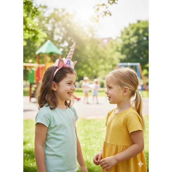 - Finitions : Corne rose pailletée, oreilles glitter, fleurs décoratives