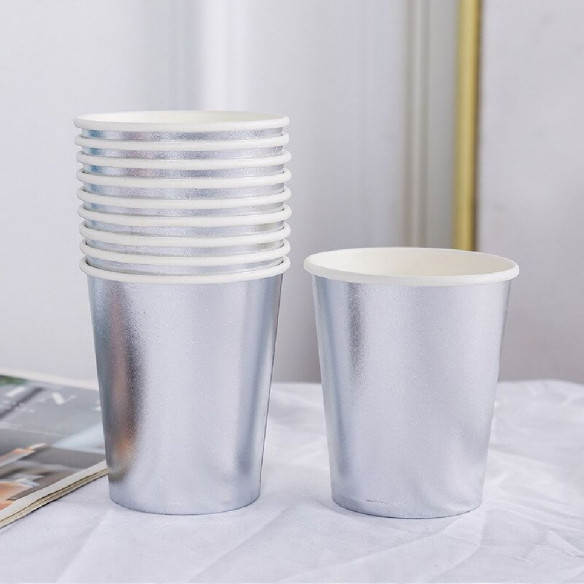 N’hésitez pas à l’assortir avec le reste de vaisselle jetable, telles des assiettes à rayures argent ou imprimées d’étoiles argentées ainsi que de jolies serviettes à motifs tendance. Ce gobelet en carton argenté se fait aussi chic avec des accessoires de couleur unie : du bleu, du corail, du noir, etc.